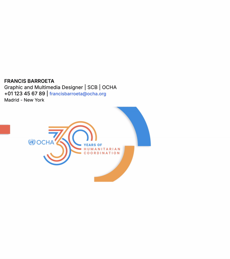 The challenge: breathe life into a commemorative graphic identity that clearly structures OCHA / 30 YEARS OF / HUMANITARIAN COORDINATION, keeping Humanitarian Coordination as OCHA’s core mission. My concept focused on the number 3—an echo of “30”: three lines that form the 30, weave into OCHA’s logo, and guide the reading flow, turning the mission into an integrated tagline. I added three accent colors from OCHA’s palette—Years of in UN blue, Humanitarian Coordination in red—as connecting threads for the system. Starting with two offset circles, I created a dynamic composition that prioritizes: OCHA logo first, then 30, and finally the mission as a strong close—three elements in perfect balance and hierarchy. From there, I developed the full identity: the commemorative logo and a social-media ecosystem that’s consistent, adaptable across formats and platforms, and carries a positive, energetic vibe in every piece.